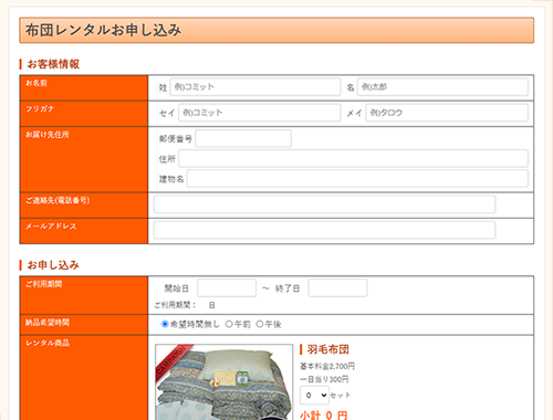 ご希望の商品をお選び、「布団をレンタルする」ボタンを押して下さい。